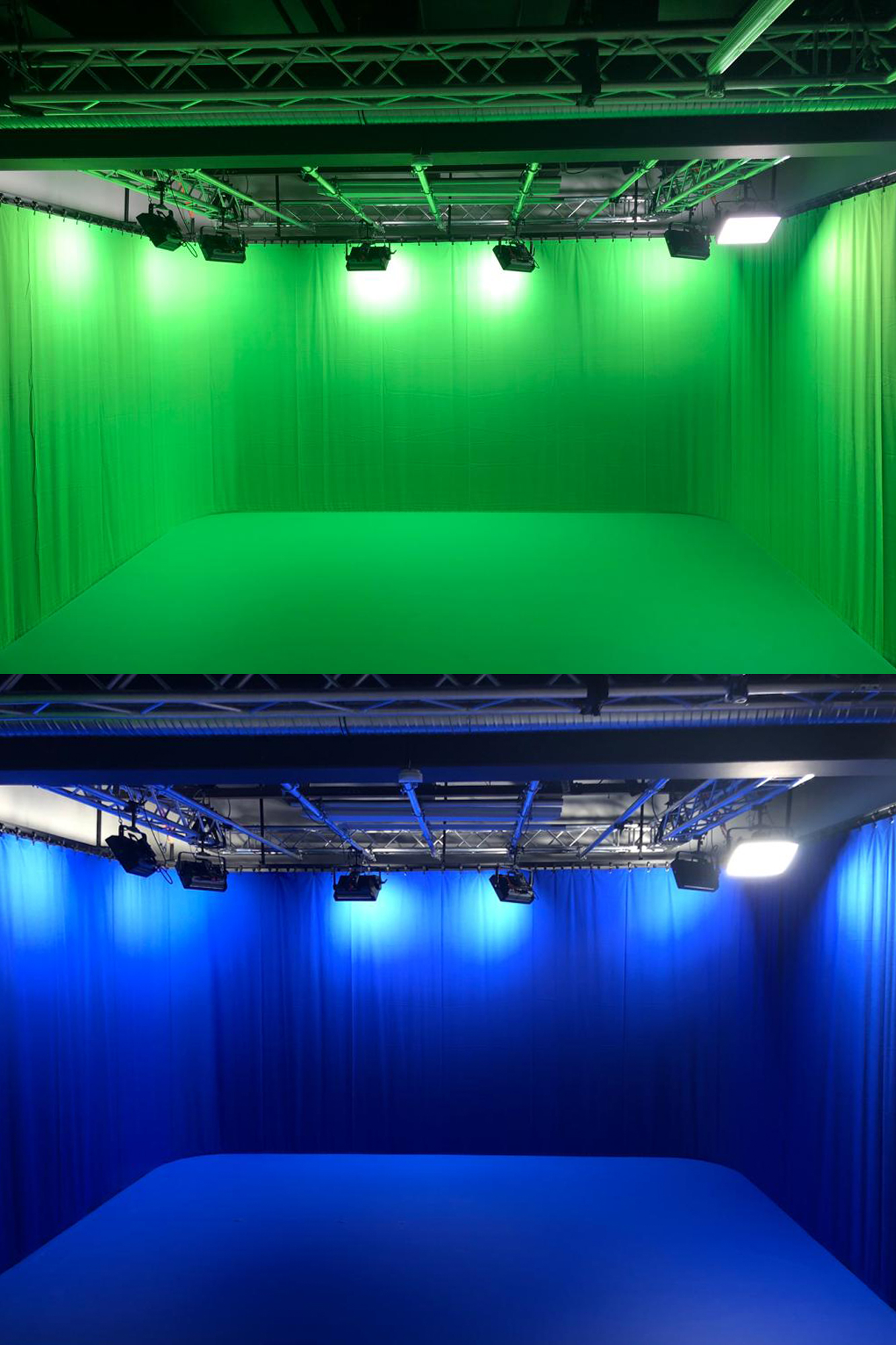 Nirgendwo sonst kann man in Köln ein so vielseitiges Studio mieten. In kurzer Zeit lässt sich unser Film- und Fotostudio mithilfe eines Vorhangsystems und auswechselbaren Böden von weiß in die Farben Grün-, Blau- und Blackscreen umrüsten. Auch die aufsteigende Bestuhlung für Zuschauer ist im Mietstudio möglich und kann den Raum z.B. in ein Kino verwandeln.
