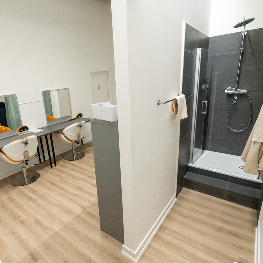 Das in Köln Braunsfeld gelegene Studio verfügt zudem über einen Maskenraum mit 2 Schminkplätzen, einer Dusche, Steamer, Waschmaschine und Wäschetrockner. Die angegliederte Teeküche versorgt dich und deine Crew mit Kaffee, Tee, Wasser und alkoholfreien Softdrinks.
